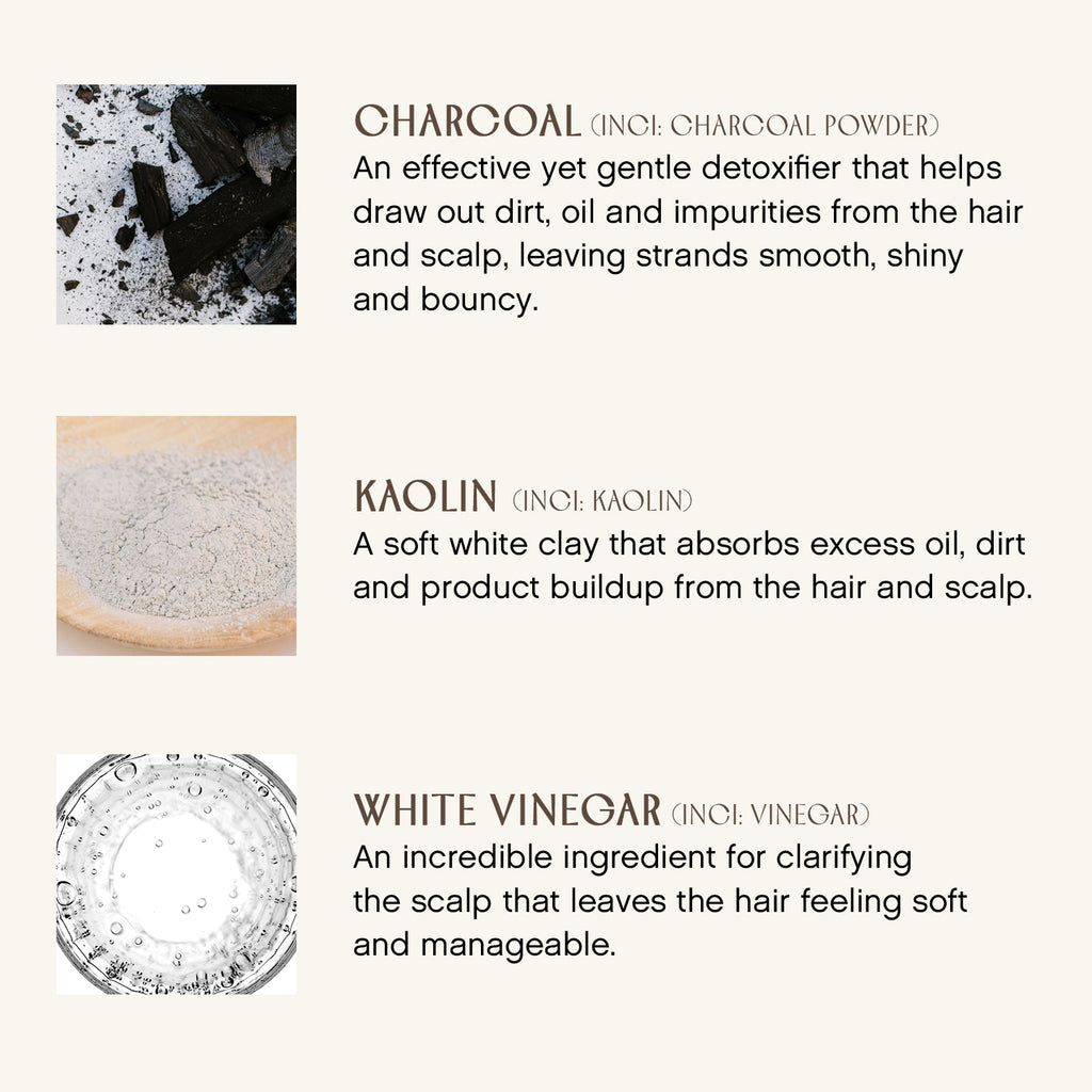 Charbon de bois, kaolin, vinaigre blanc biologique