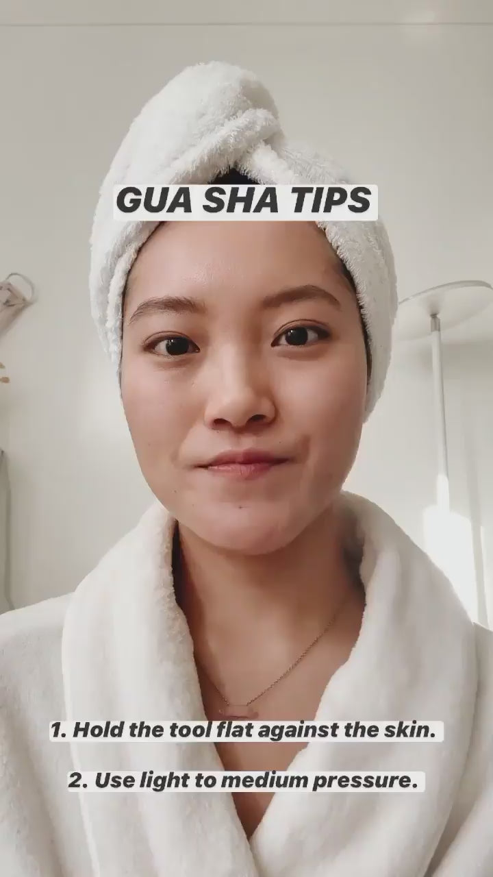 - Start with a clean face and prep skin with a facial oil or serum to enhance the glide of the gua sha tool and nourish the skin. We love to pair the gua sha tool with Mount Lai's natural skincare products, which are made from nourishing herbs & plants and designed to pair with our tools. -Keep the tool flat against the face and begin with the forehead. Scrape in an upwards motion from the eyebrows to the hairline. - Move to the cheeks and scrape in an outwards motion starting from the crease of the nose until the ear. - Move to the jawline and use the end of the gua sha tool with the two curves. Start from the chin and scrape until the ear. Gently massage the gua sha tool into the ear to release tension. - For the under-eye area, very gently scrape the gua sha tool from the inner corner of the eye outwards to the temple. Because the area is so sensitive, it is important to only apply light pressure.